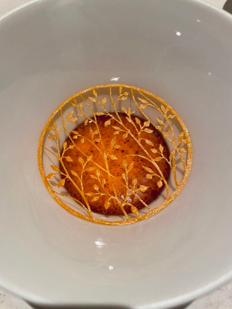 The tasting experience unfolds through a sequence of small, meticulously crafted dishes, many inspired by the forests and coastline of his childhood. Art and craft shape the atmosphere, with handmade Bornholm ceramics and custom installations throughout the space.