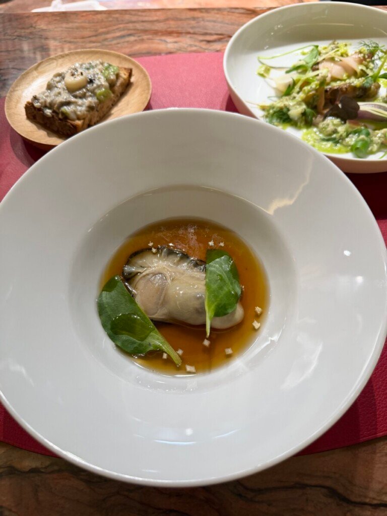 - Oyster pot au feu, baby vegetables oyster gribiche and tartine with oysters