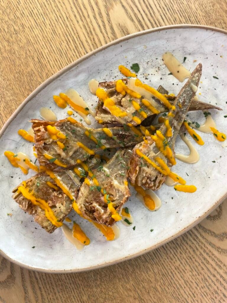 - Fried artichokes with lemon vinaigrette and carrot ketchup