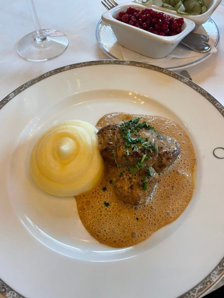 - Swedish meatballs in cream sauce, with potato purée, lingonberries and pickled cucumber