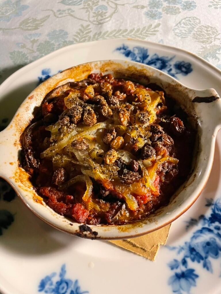 - Eggplant bake with potatoes, tomato sauce, onions, oregano and raisins.