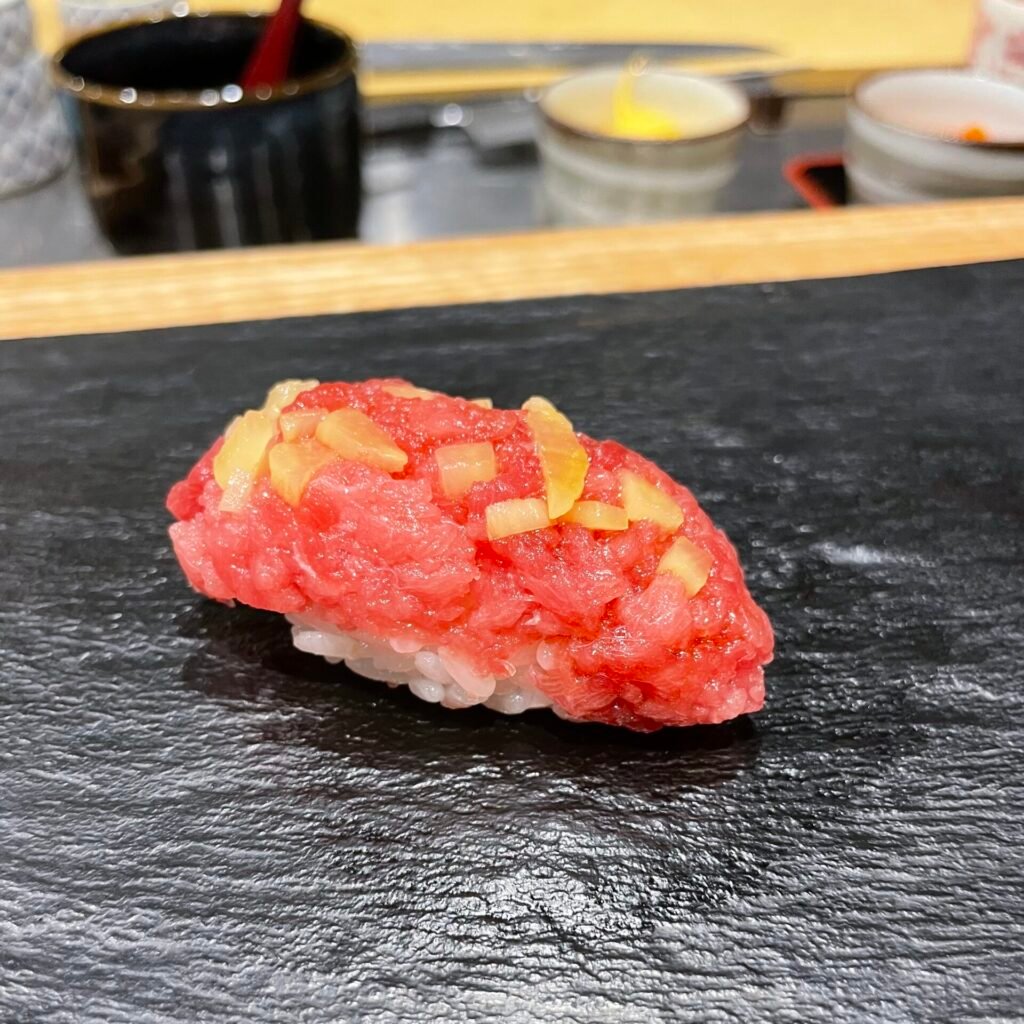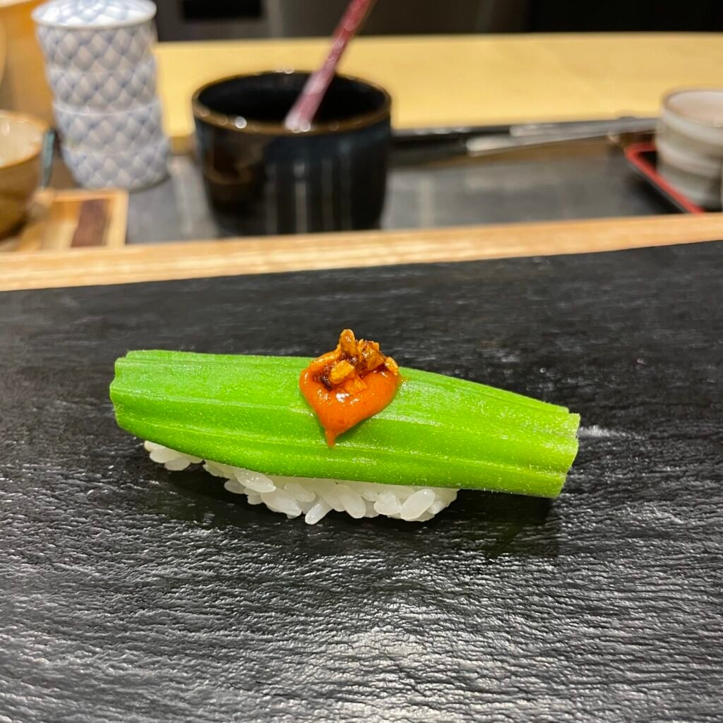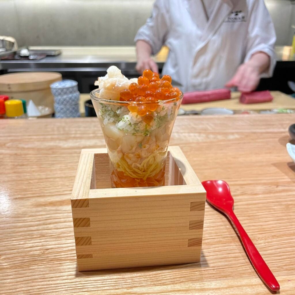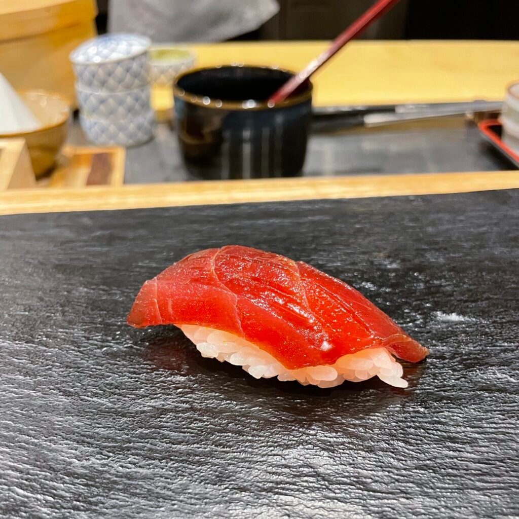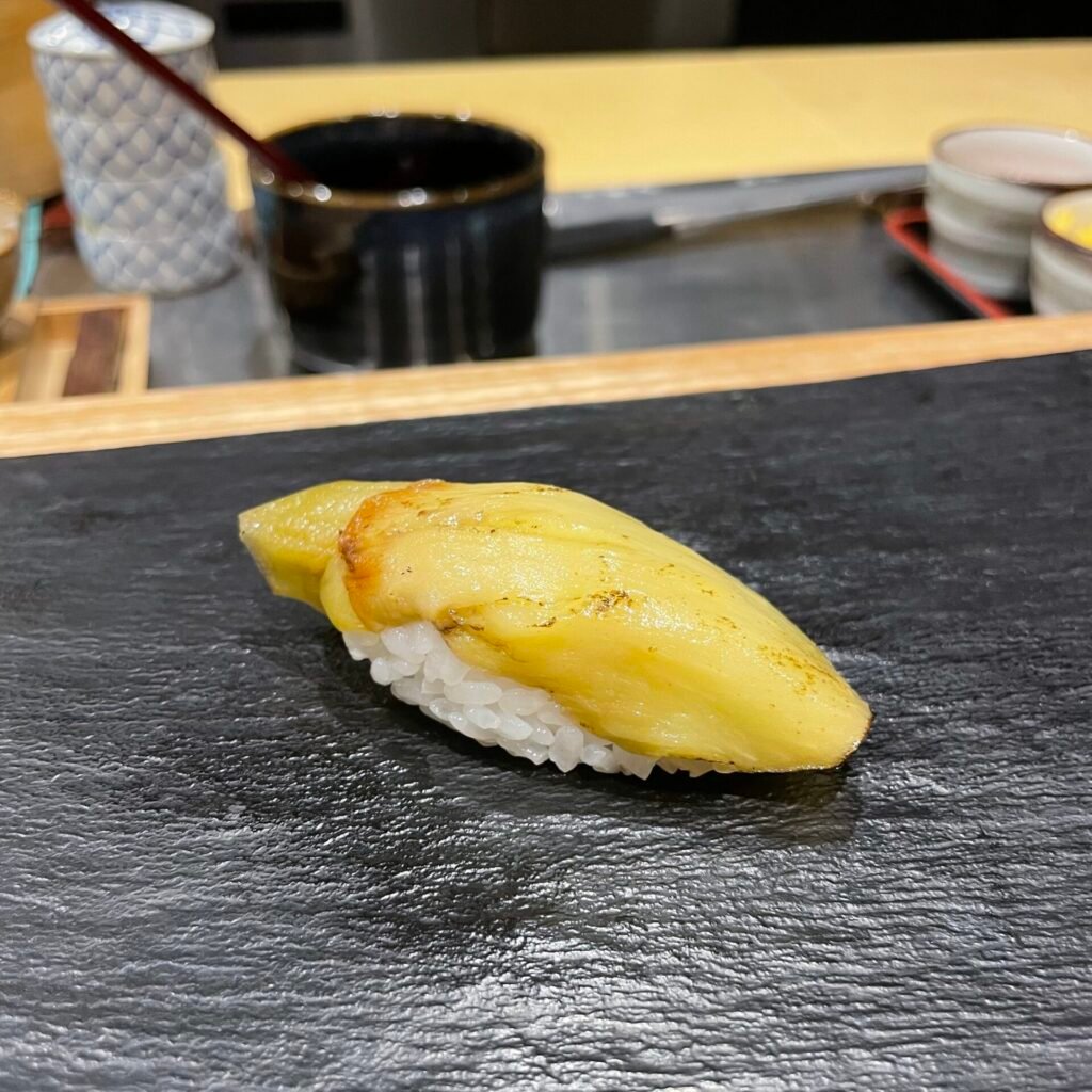 The first “standing sushi” restaurant in London is an outpost of Tachigui Sushi Tonari in Tokyo and is known by its head chef Hatano Yoshiki signature aubergine nigiri. Technically, it is no longer a “standing sushi” restaurant, as there are chairs at the counter; however, the fresh spirit and talent of this Japanese-run establishment are still present. The cost for lunch omakase ranges between £60 and £85, (£22- £ 38 for a lunch set menu) while dinner prices range from £80 to £120. I would choose Sushi Tonari for a more casual meal because of its popular and somewhat underwhelming location for this type of meal.