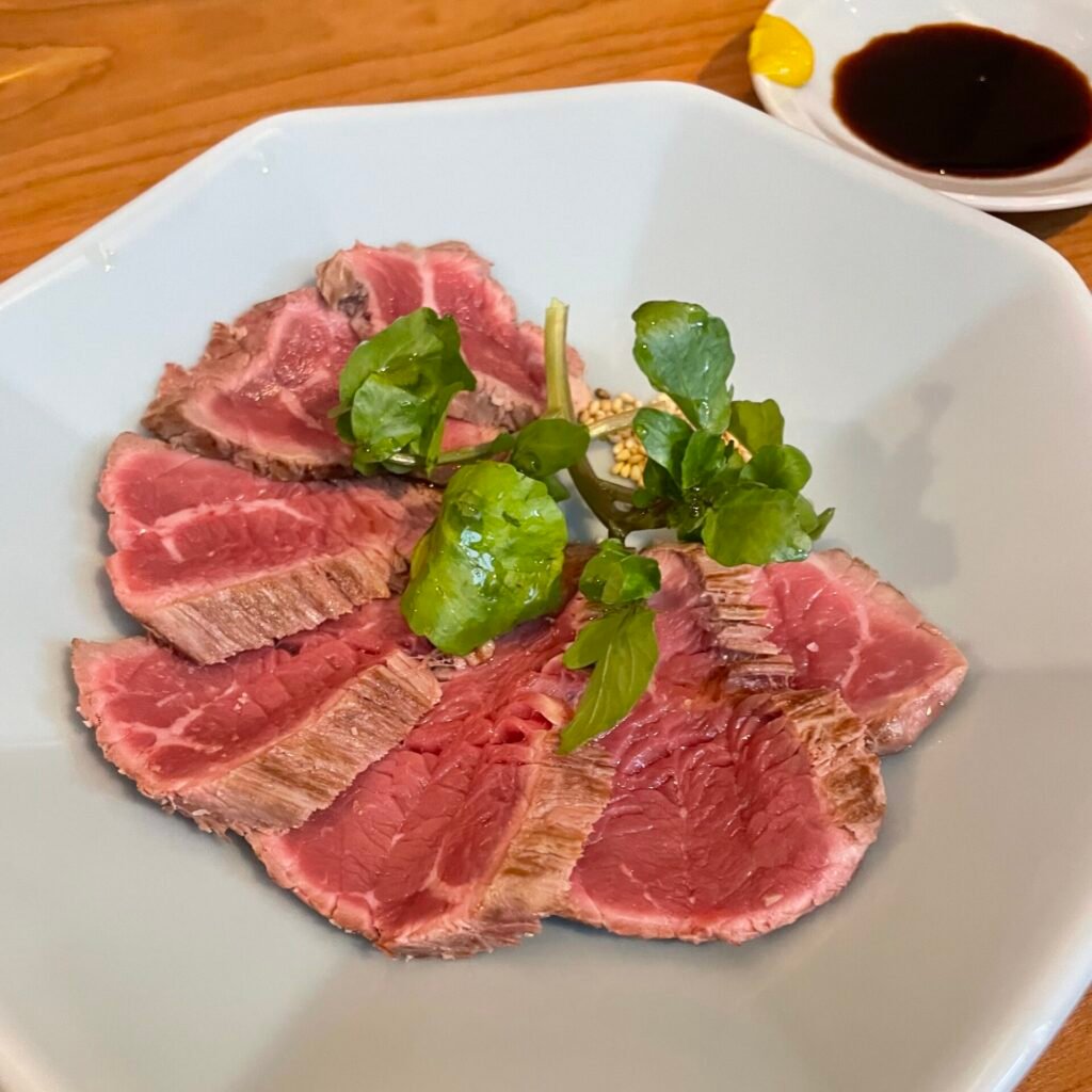 - Beef tataki with soy sauce and mustard